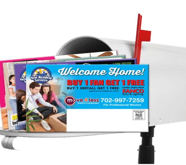 We offer mailings to homebuyers for a cost as low as 7.5 cents each! Our shared direct mail program is currently available in the Las Vegas and Phoenix metro areas and reaches recent homebuyers shortly after they arrived in the neighborhood with a special welcome offer or call-to-action.